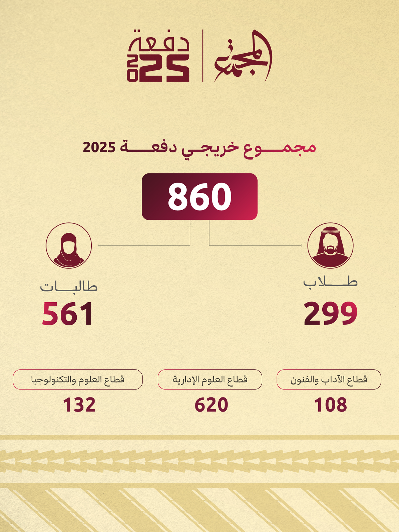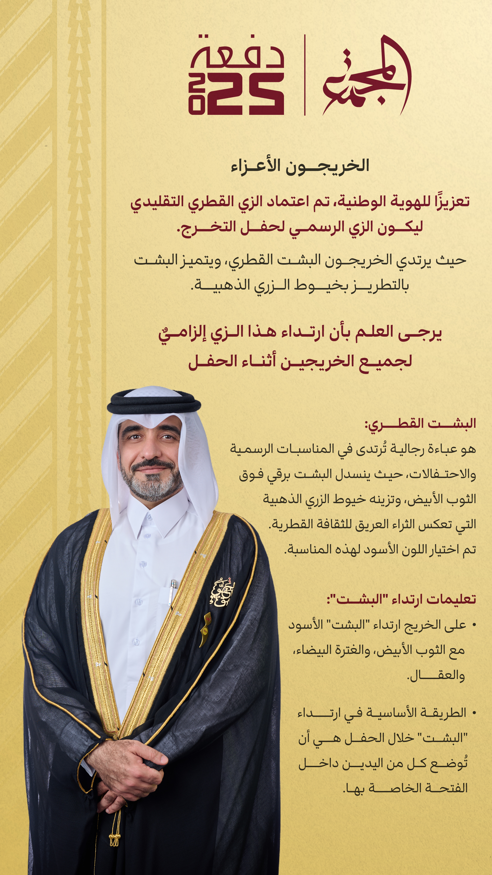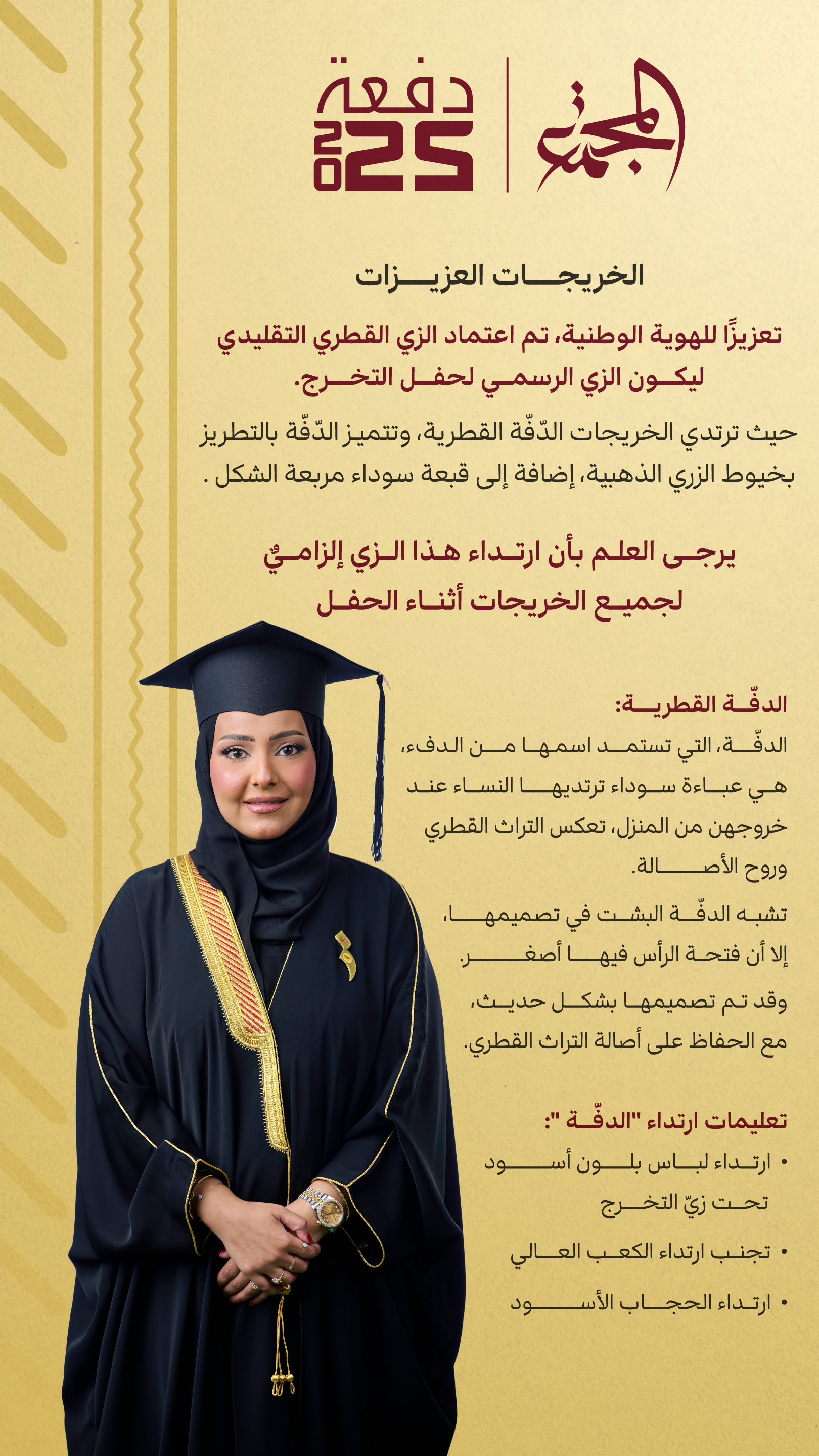 ويمكن للخريجين والخريجات مشاركة اللقطات التذكارية الشخصية أو مع زملائهم؛ عبر وسائل التواصل الاجتماعي؛ باستخدام الوسم #CCQGrad2025.