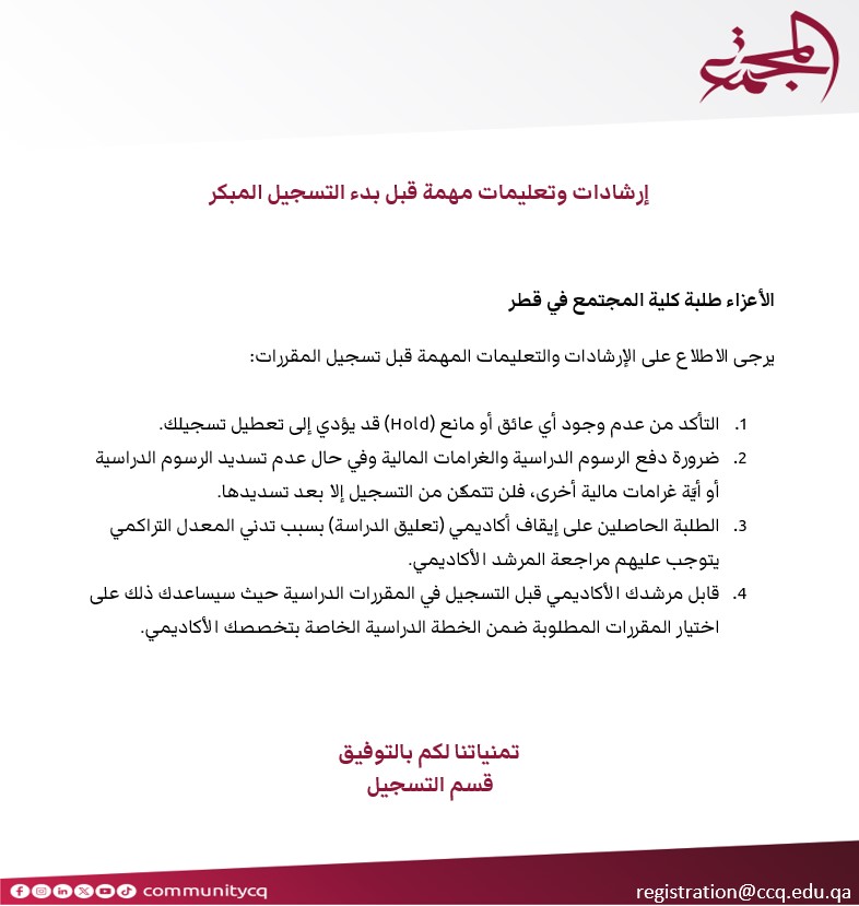 For more information or inquiries, contact us at registration@ccq.edu.qa or call 16070.